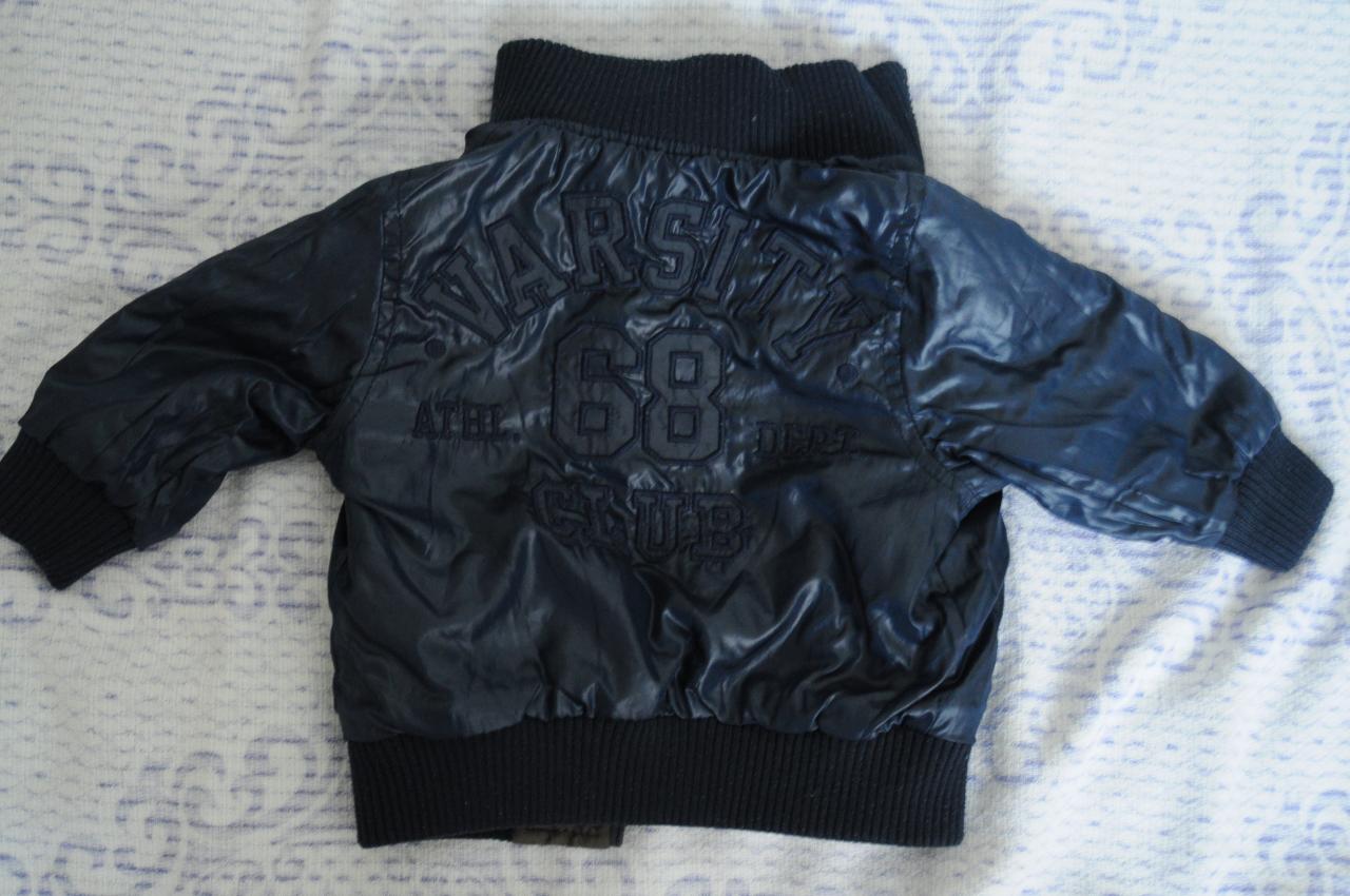 Продам двустороннюю курточку в очень хорошем состоянии на весну. Покупала в магазине United Colors of Benetton (СитиЦентр). Одна сторона темно зеленая с полосами (в основном ее и носили, очень хорошо смотрится!), другая сторона темно синяя. Курточка на змейке с высоким мягким воротом. Носили от 6 месяцев до 11 месяцев (немного весной, пару раз осенью). Цена 110 грн.