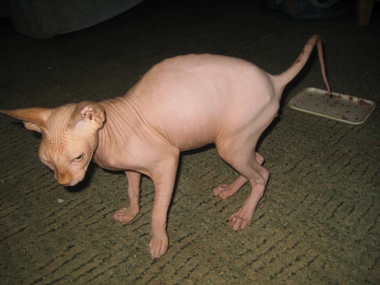 живот нормальный, сфинксячий после еды)) я его накормила, а глистов обязательно буду гнать!