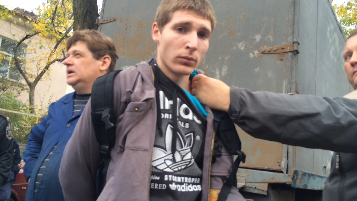 поймал парень, который держит его. Он молодец, воришка через дворы побежал, а этот паренек на авто по запорожской объехал, и на Болгарской уже поймал его