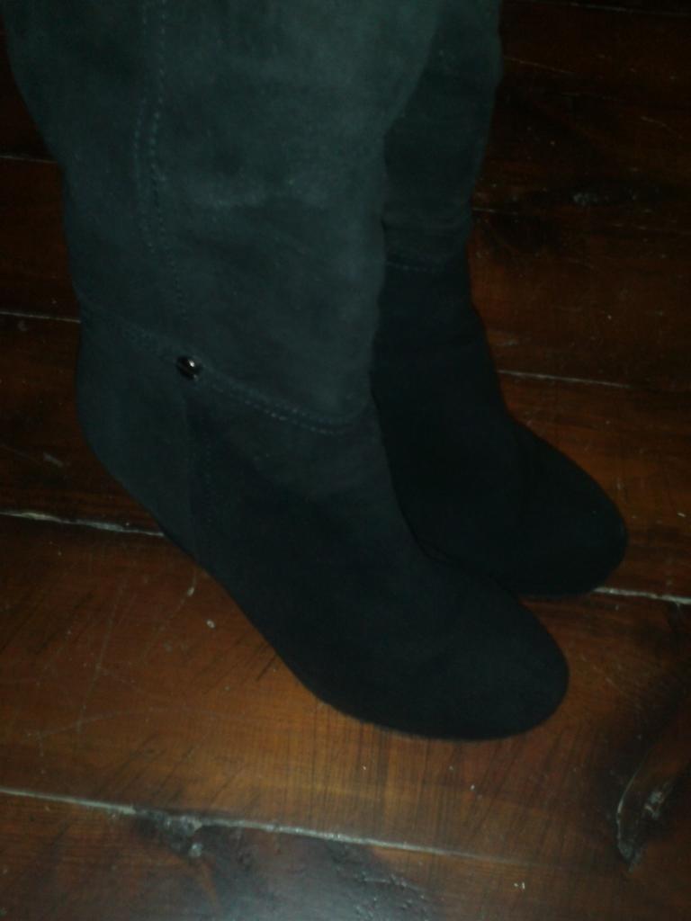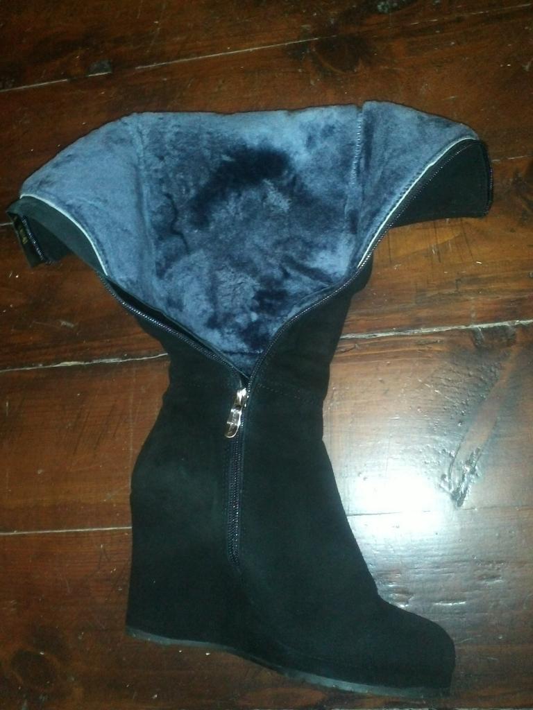 Черная замша, молния золото, байка теплая. Очень удобные и красивые. Все материалы натуральные. Высота сапога 50 см.