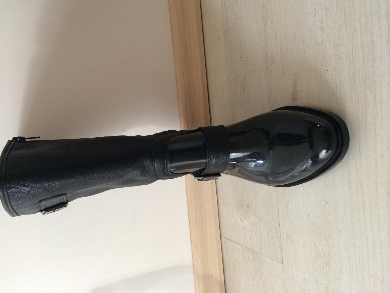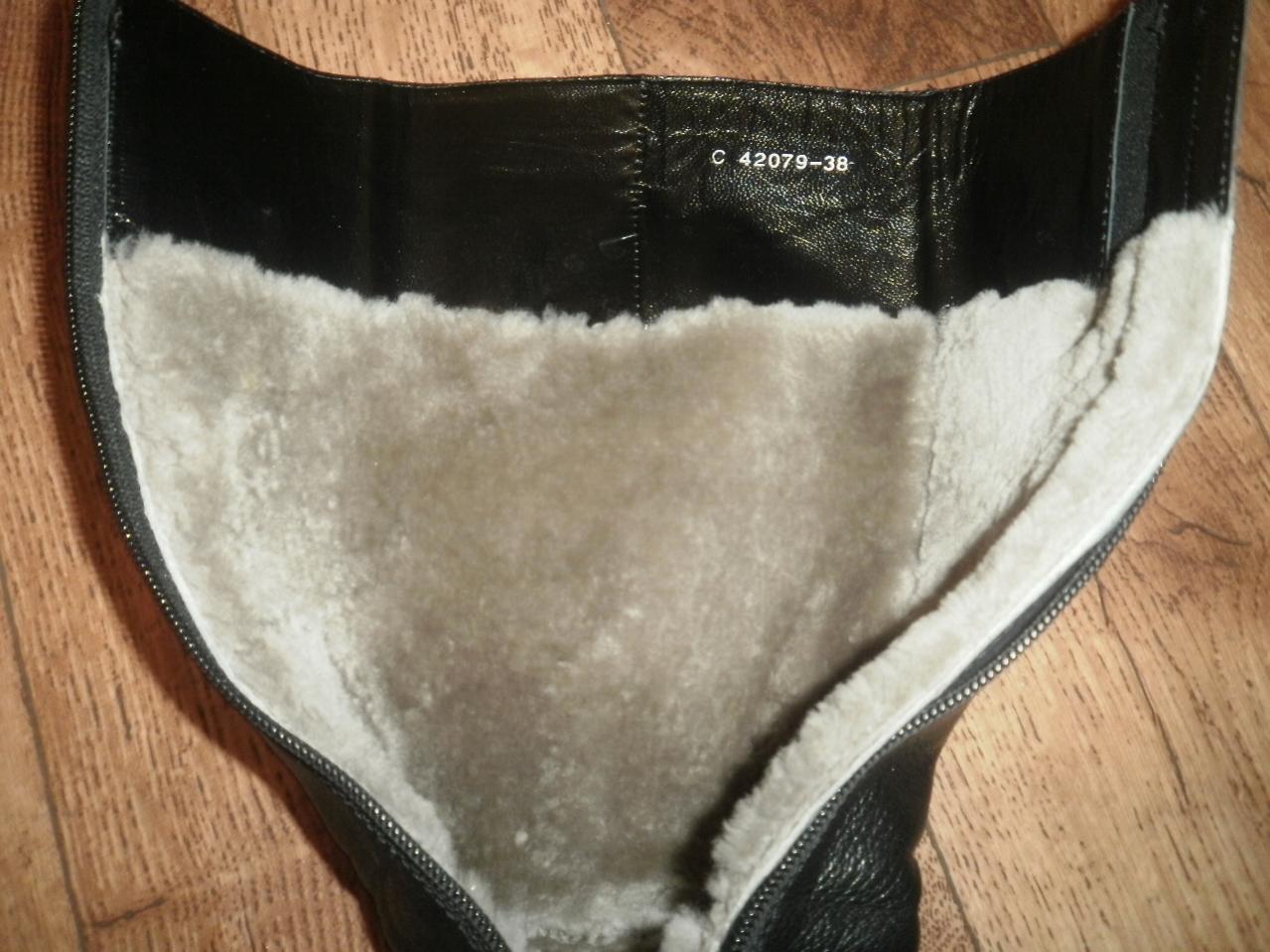 Черная кожа , молния золото , байка и овчина .Хит продаж. Очень удобные и красивые. Все материалы натуральные. Высота по заднему шву 42 см, (впереди выше на 5 см.).