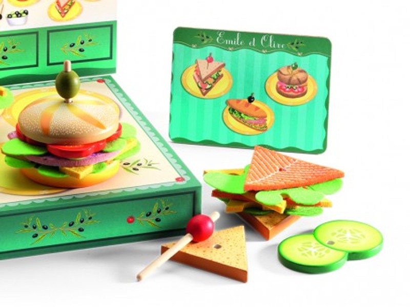 Рыба? Сыр? Салат? Сделайте свой выбор и Эмиль с Оливией приготовят для вас любой деликатес. В этой красивой деревянной коробочке прячется целый магазинчик сендвичей с уникальными ингредиентами, которые не оставят равнодушным ни одного гурмана! Можно приготовить бутерброд из красочного меню-инструкции, а можно и самому придумывать все новые и новые сендвичи, ведь разнообразие продуктов, нарезанных аккуратными дольками, открывает простор для фантазии маленького шеф-повара.