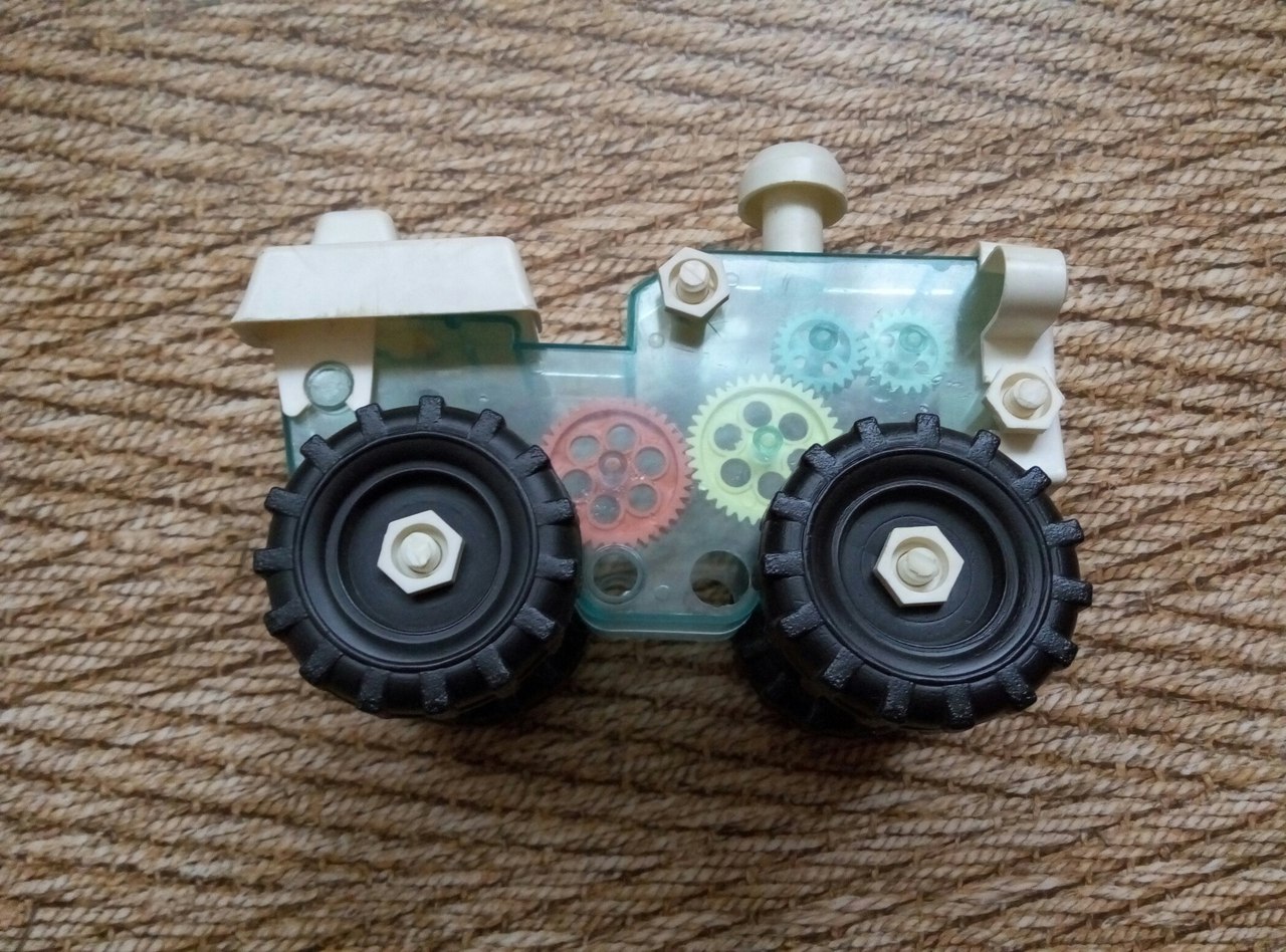 Вот такая вот игрушка. Когда вращаются колеса данного агрегата, вращаются и шестерни. Пособие для начинающих маленьких механиков