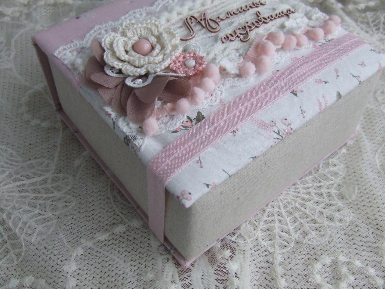 1. Мамины сокровища на три коробочки - бирочка, носочки, приятные мелочи, есть конвертик под первый локон и карточка для первого фото. Сделаны из плотного переплетного картона, обтянуты синтепоном и тканью ( мягенькие). Внешние размеры 16.5*14.5*7.5 см В наличии 350 грн.