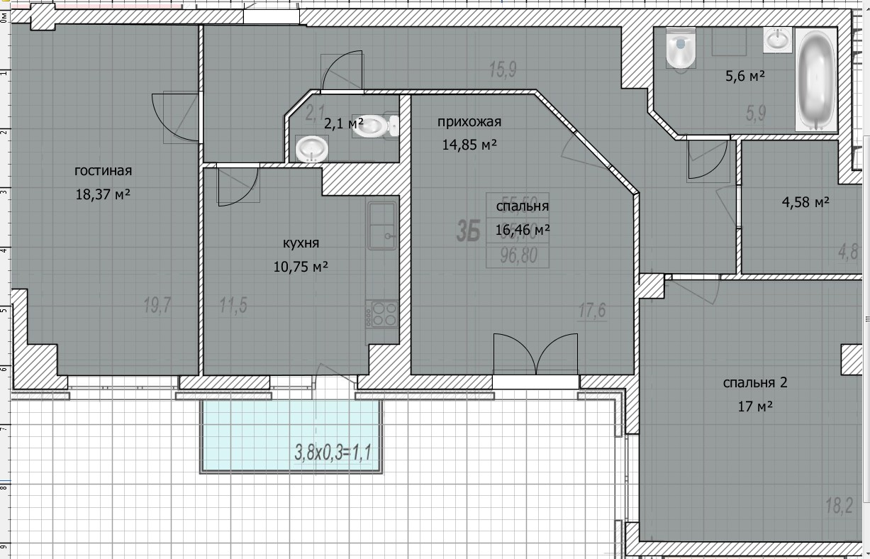 1-комнатные квартиры площадью от 38,7 кв.м.