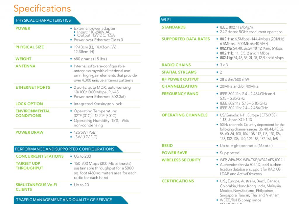 Топовая точка доступа прошлых лет от ведущей компании-производителя Wi-Fi оборудования Ruckus. Новая стоила больше 1000$. Основной плюс по сравнению с другими производителями - патентованная технология BeamFlex, когда система антенн направляет сигнал точно к клиенту, а не везде вокруг. Благодаря этому увеличивается покрытие, чувствительность антенн, уменьшается интерференция между соседними точками. 4000 шаблонов направленности. Антенна этой модели по сравнению с другими точками Ruckus даёт более широкое покрытие в горизонтальной плоскости в ущерб вертикальному (когда подвешена на потолок или стоит на столе). Два диапазона 2.4 и 5 ГГц общей пропускной способностью 600 Мбит/сек 2 порта по 1Гбит с питанием по PoE 200 пользователей на точку Покрытие 460 квадратов (по факту больше, радиус около 40 метров) Отличное решение для беспроблемного Wi-Fi для ресторанов, отелей, конференц залов и других точек с высокой нагрузкой Продаётся без блока питания (можно использовать питание по PoE, можно использовать БП 12В 1,5А)