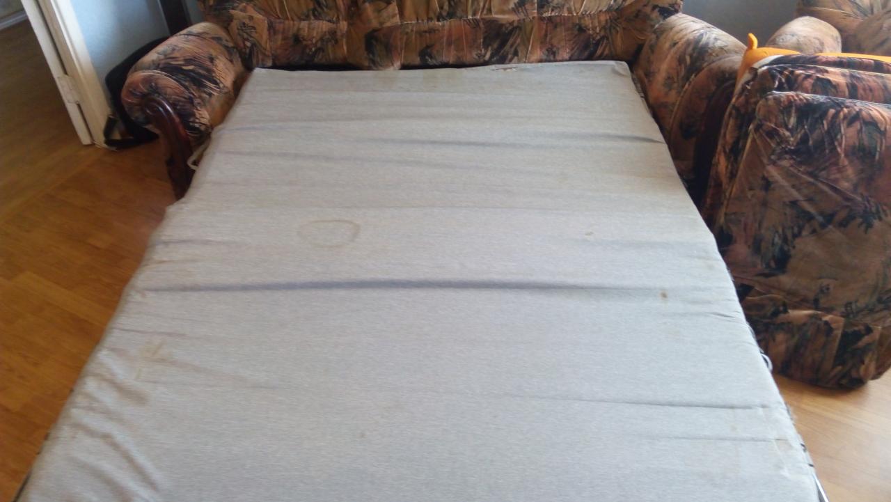 Механизм в диване работает, но заедает (надо шото там покрутить и настроить), нужно прикрутить ламели (они есть), заменить или постирать матрац.