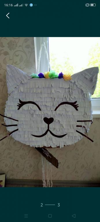 Размер 67х55 см. Внизу открывается крышка. Сверху есть веревки для подвески, а так же веревки чтоб дергать пиньяту.