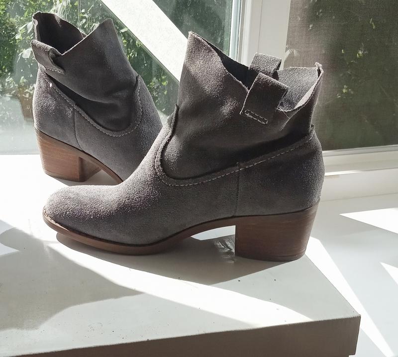 Серые ботильоны из натуральной замши, выполненные в сочетании двух стилей- вестерн и кантри, это оригинальное сочетание дерзкого образа ковбоя и спокойствия истинного кантри, легко впишутся практически в любой образ. В отличии от казаков, имеют элегантный, закругленный, миндалевидный носок и свободное, невысокое, мягкое, не обработанное по краю среза голенище.