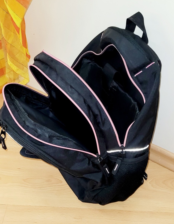 3 отделения; есть отсек для ноута (планшета, эл.книги); кармашки для канцелярии, мелочевки, бутылки. Все змейки удобные, работают идеально.