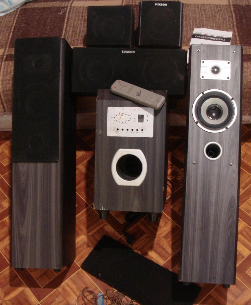 Продам акустику Luxeon 5.1, кнопки управления утеряны, кое где обшарпался шпон на углах колонок, но в рабочем состоянии (переключаю кнопки палочкой), есть пульт и шнуры. Состояние на фото. Прошу за него 1000 гривен. 0637905205.