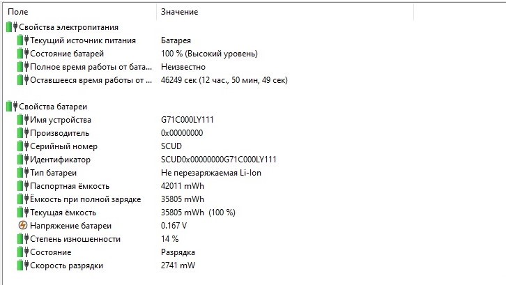 Батарея 42 Wh износ 14% текущая емкость 35,8 Wh