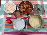 Пюре, куриные спинки, домашняя квашеная капуста.